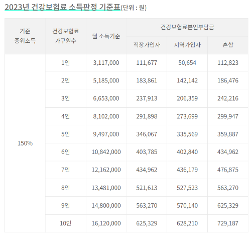 : 소득요건은 위의 건강보험료 소득기준표 기준 중위소득 150% 이하 입니다.