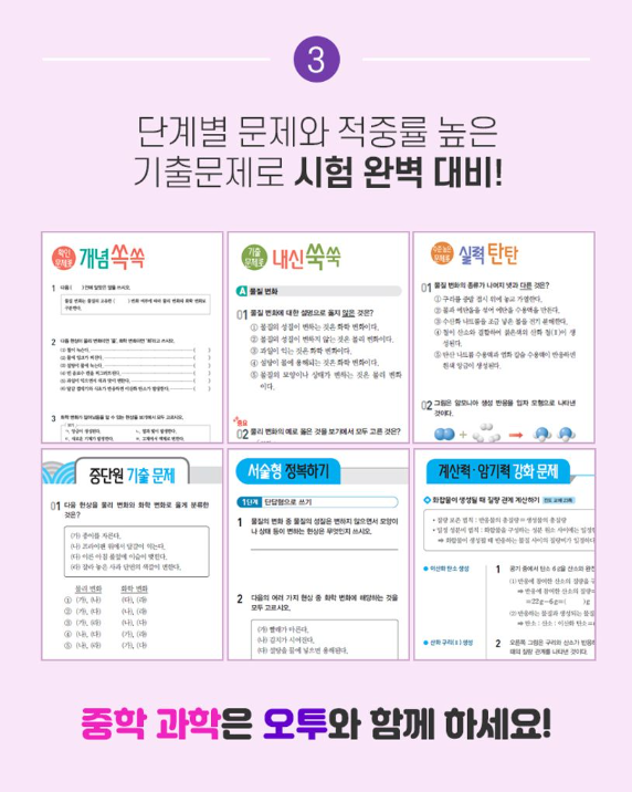 오투 중학과학 3-1 교재는 현대 학습 요구에 부합하고, 핵심 개념을 명확히 이해하고 응용할 수 있도록 구성되었습니다. 이 교재는 실험, 탐구, 그리고 문제 해결을 중심으로 학습자들이 학습 과정에서 호기심을 자극하고 더 나은 이해를 돕습니다. 아래는 중등 3-1 과학을 더욱 흥미롭고 재미있게 배우고, 학생들이 개념을 깊이 있게 이해할 수 있도록 구성되어 있는 이 교재의 주요 특징과 장점, 그리고 답지에 대한 소개입니다.